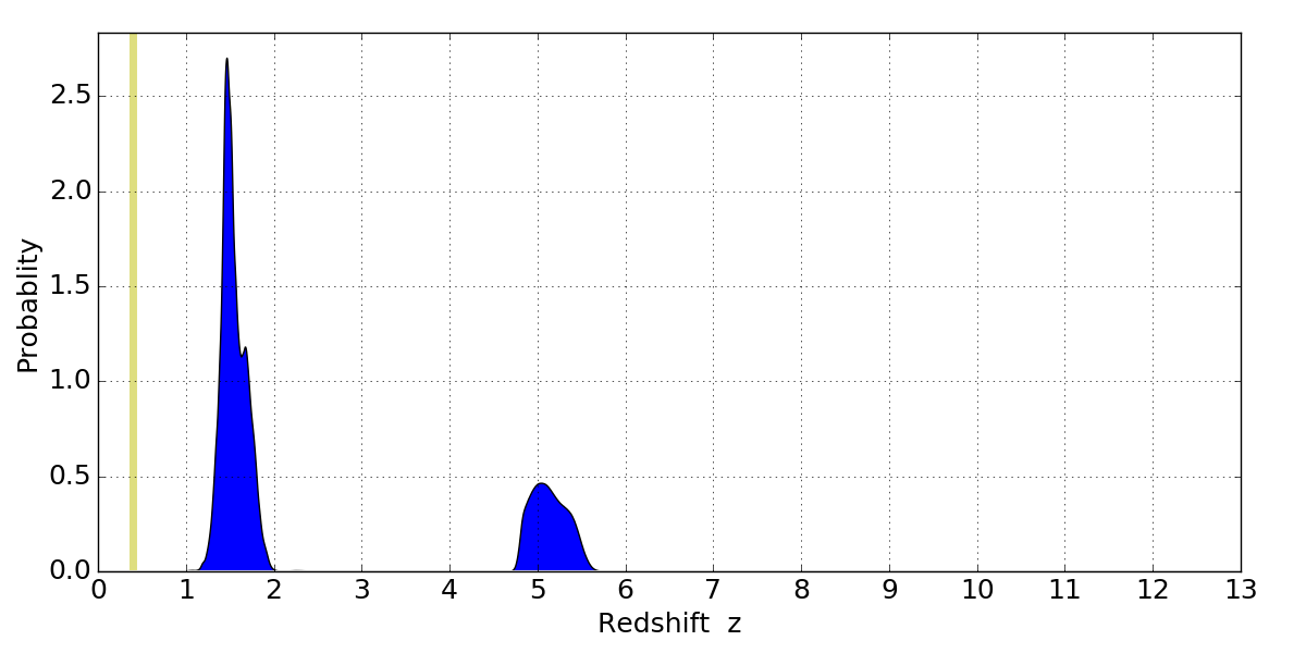 In P(z) plots: Yellow lines mark the cluster redshift z = 0.396,