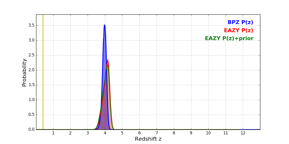 In P(z) plots: Yellow lines mark the cluster redshift z = 0.396,