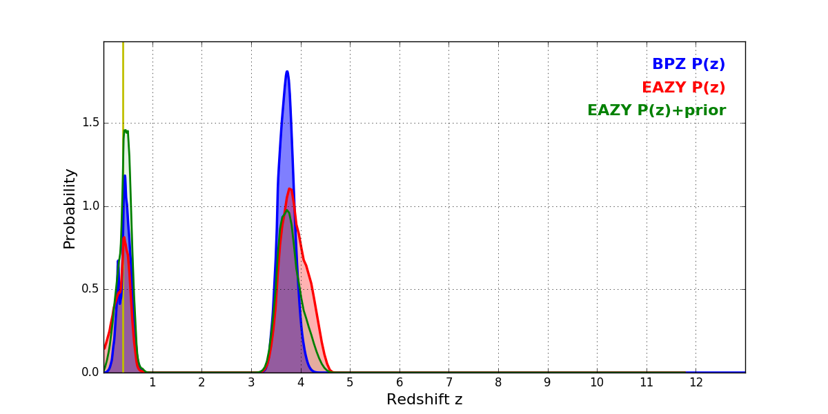 In P(z) plots: Yellow lines mark the cluster redshift z = 0.396,