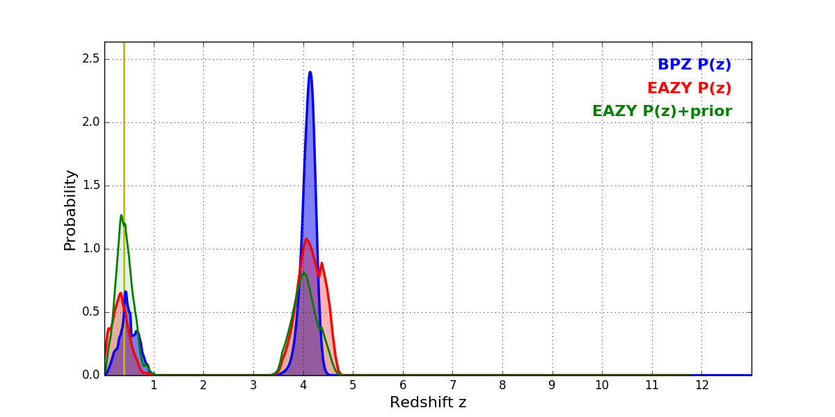In P(z) plots: Yellow lines mark the cluster redshift z = 0.396,