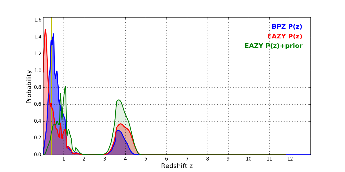 In P(z) plots: Yellow lines mark the cluster redshift z = 0.396,