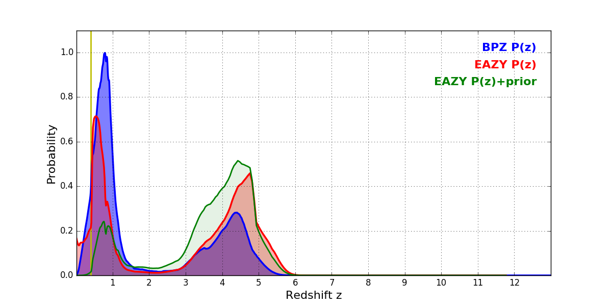 In P(z) plots: Yellow lines mark the cluster redshift z = 0.396,