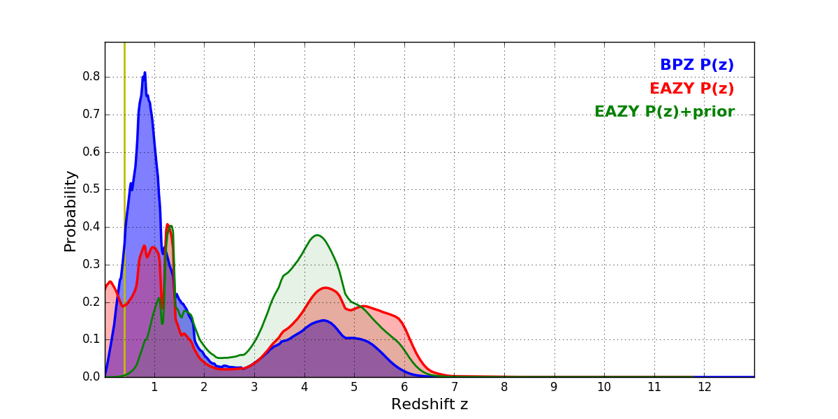 In P(z) plots: Yellow lines mark the cluster redshift z = 0.396,