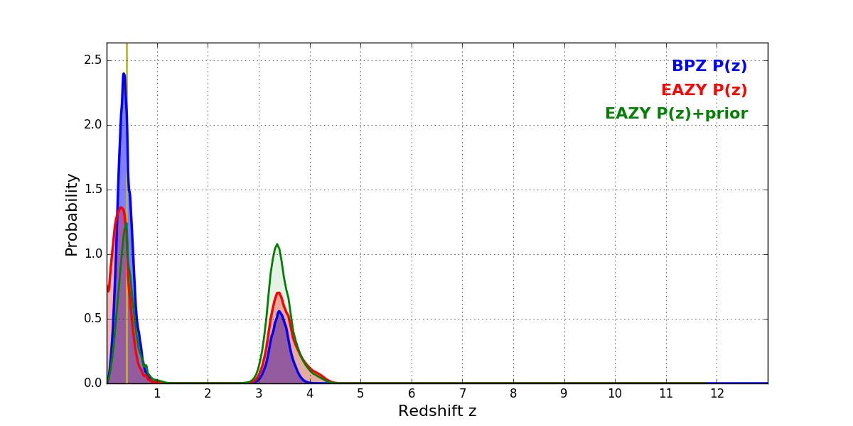 In P(z) plots: Yellow lines mark the cluster redshift z = 0.396,