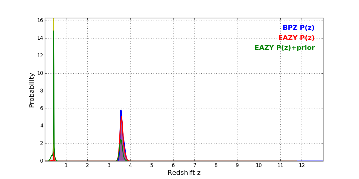 In P(z) plots: Yellow lines mark the cluster redshift z = 0.396,