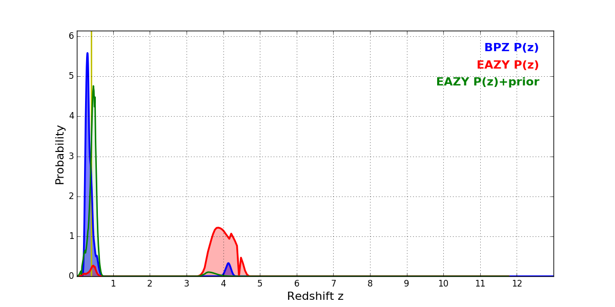 In P(z) plots: Yellow lines mark the cluster redshift z = 0.396,