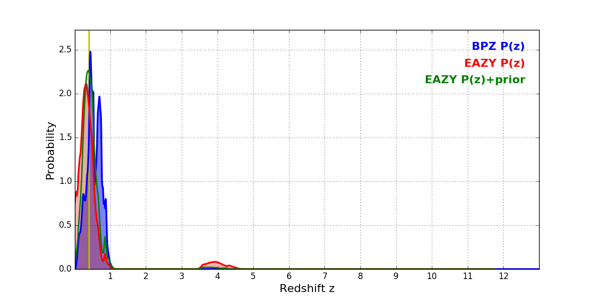 In P(z) plots: Yellow lines mark the cluster redshift z = 0.396,