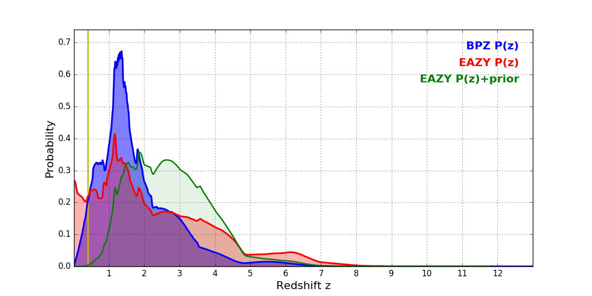 In P(z) plots: Yellow lines mark the cluster redshift z = 0.396,