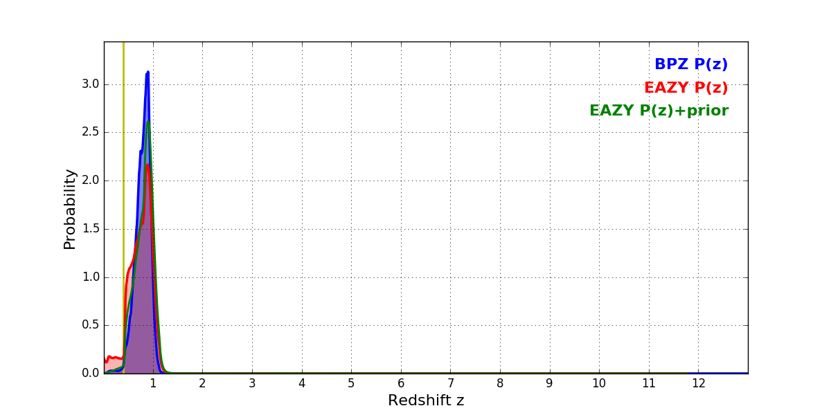 In P(z) plots: Yellow lines mark the cluster redshift z = 0.396,