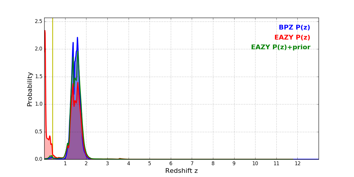 In P(z) plots: Yellow lines mark the cluster redshift z = 0.396,