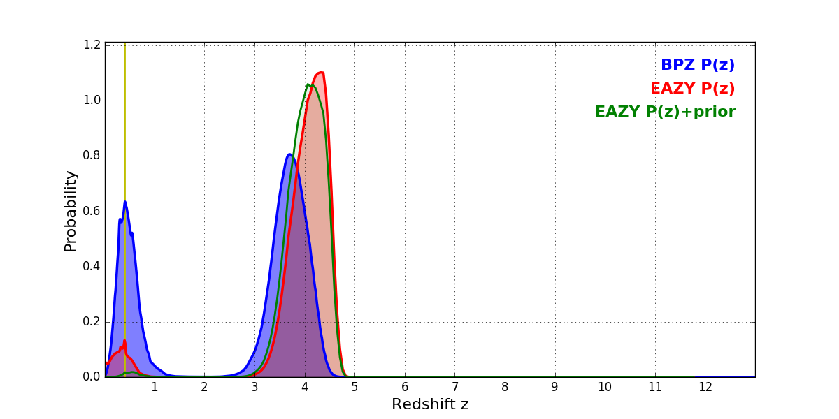In P(z) plots: Yellow lines mark the cluster redshift z = 0.396,