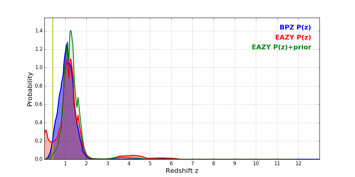 In P(z) plots: Yellow lines mark the cluster redshift z = 0.396,