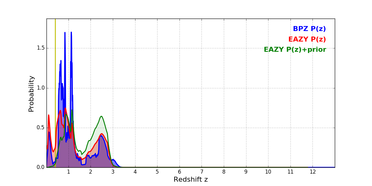 In P(z) plots: Yellow lines mark the cluster redshift z = 0.396,