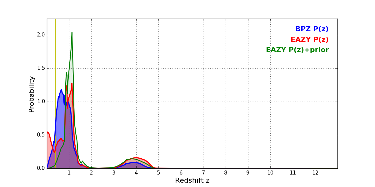 In P(z) plots: Yellow lines mark the cluster redshift z = 0.396,