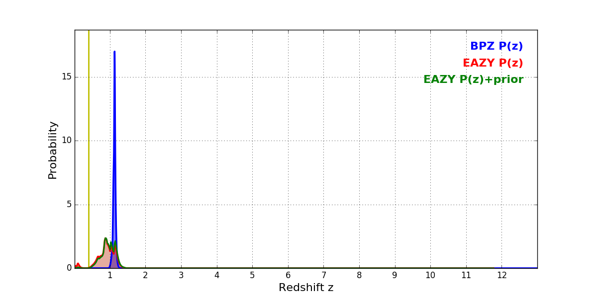 In P(z) plots: Yellow lines mark the cluster redshift z = 0.396,