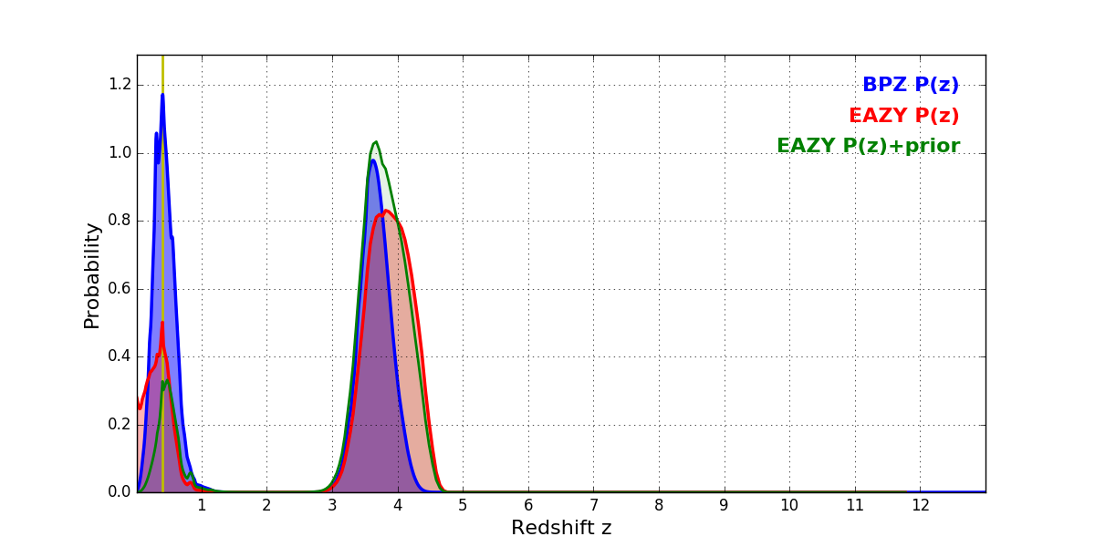 In P(z) plots: Yellow lines mark the cluster redshift z = 0.396,