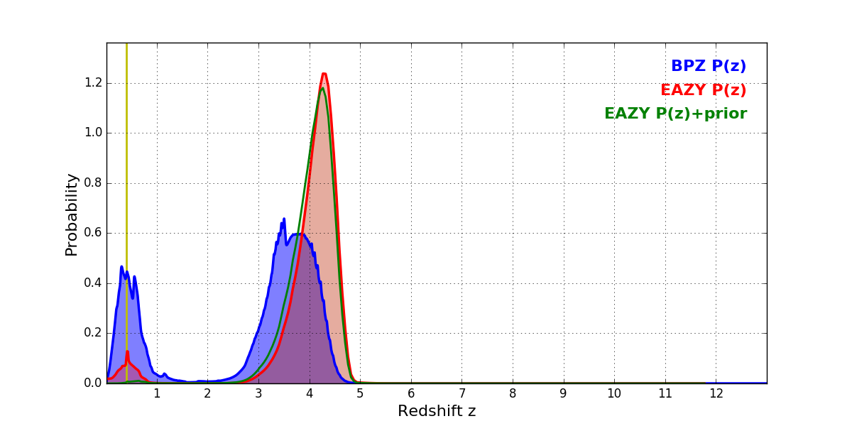 In P(z) plots: Yellow lines mark the cluster redshift z = 0.396,