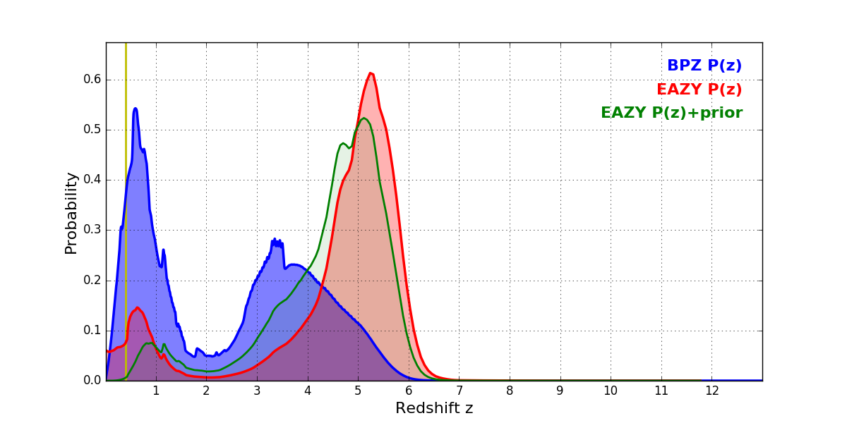 In P(z) plots: Yellow lines mark the cluster redshift z = 0.396,