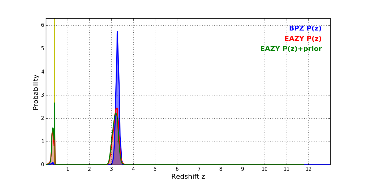 In P(z) plots: Yellow lines mark the cluster redshift z = 0.396,