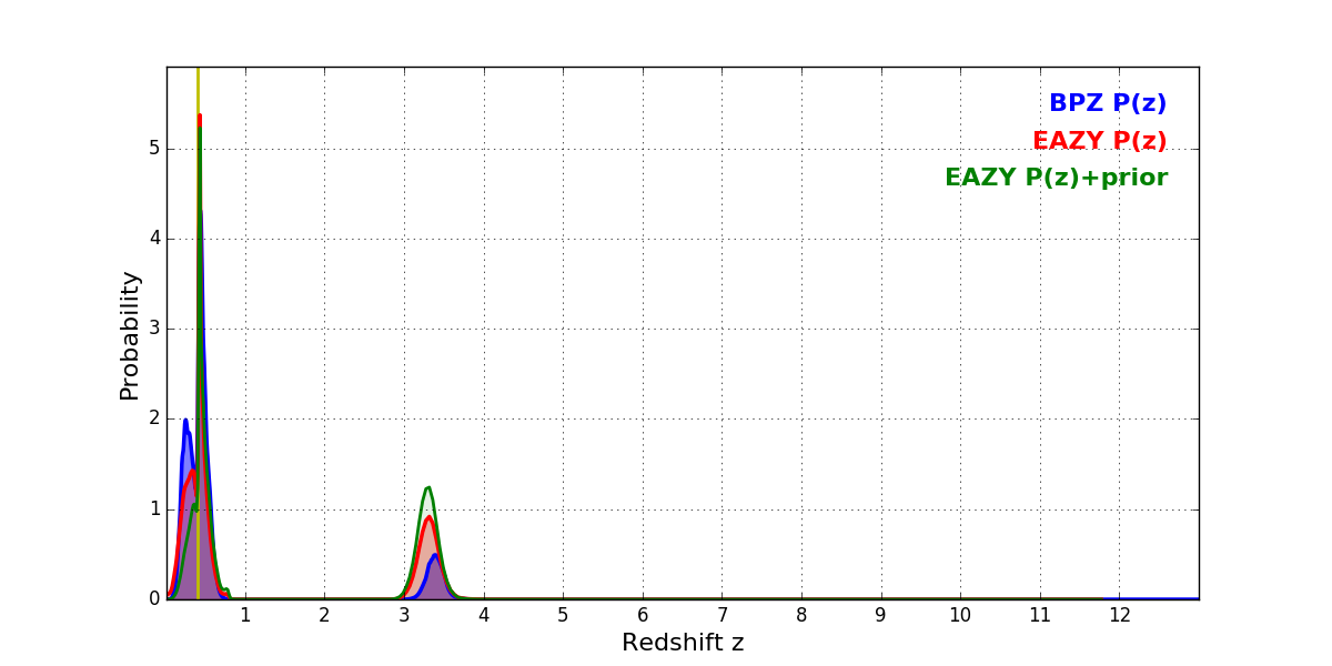 In P(z) plots: Yellow lines mark the cluster redshift z = 0.396,