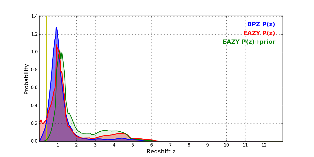 In P(z) plots: Yellow lines mark the cluster redshift z = 0.396,