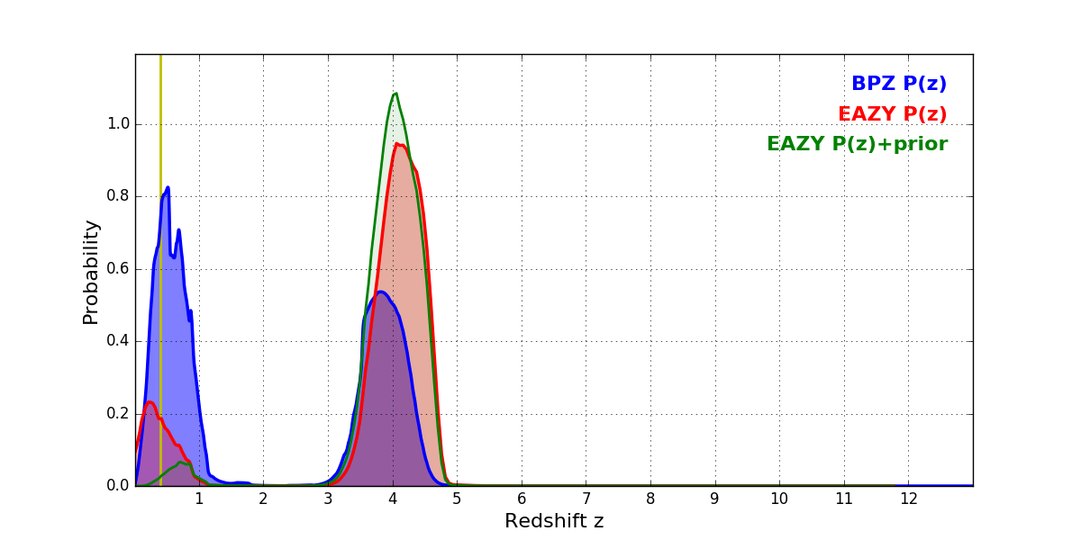 In P(z) plots: Yellow lines mark the cluster redshift z = 0.396,