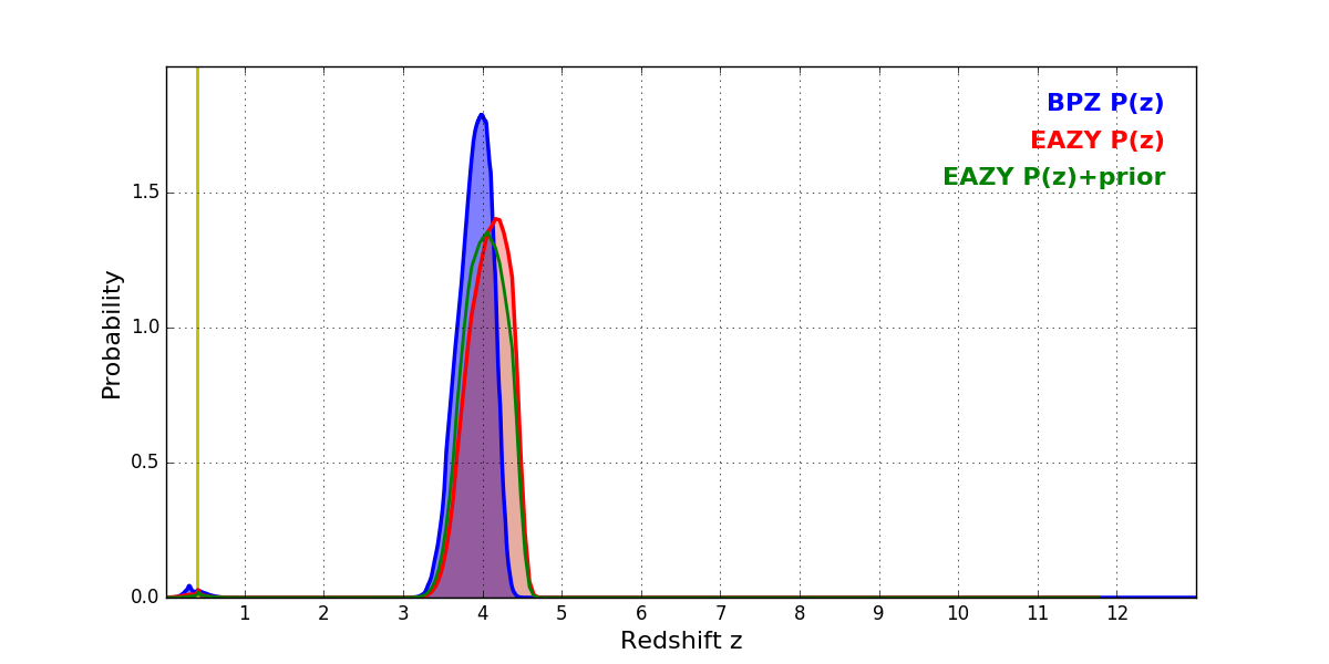 In P(z) plots: Yellow lines mark the cluster redshift z = 0.396,