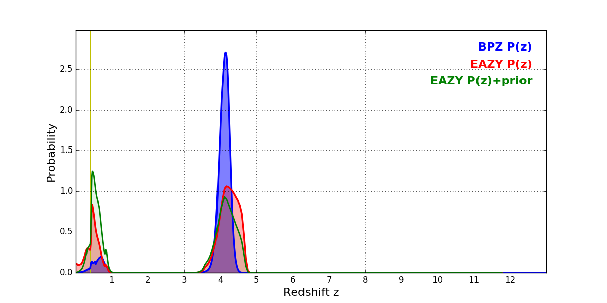 In P(z) plots: Yellow lines mark the cluster redshift z = 0.396,