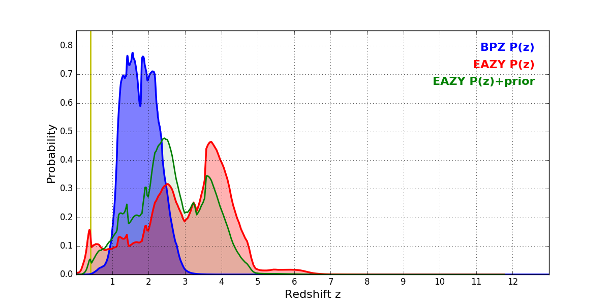 In P(z) plots: Yellow lines mark the cluster redshift z = 0.396,