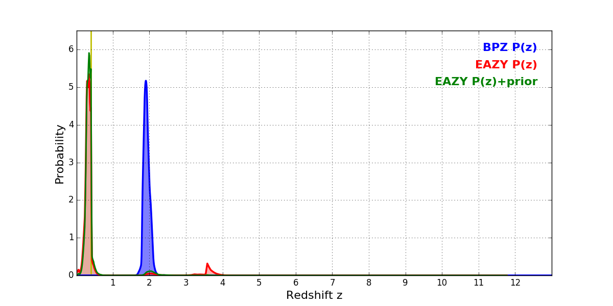 In P(z) plots: Yellow lines mark the cluster redshift z = 0.396,