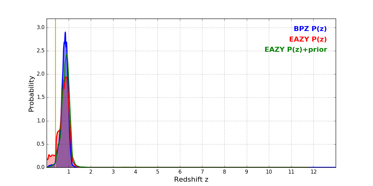 In P(z) plots: Yellow lines mark the cluster redshift z = 0.396,