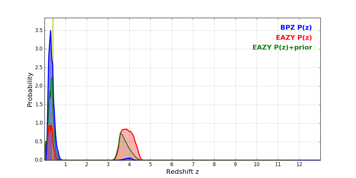 In P(z) plots: Yellow lines mark the cluster redshift z = 0.396,