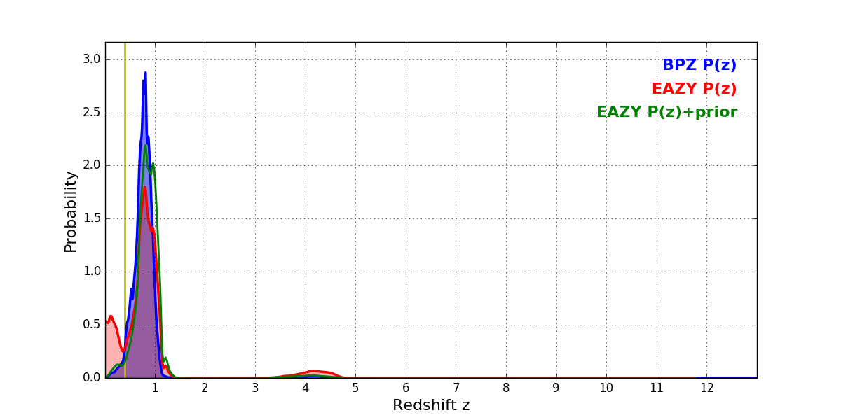 In P(z) plots: Yellow lines mark the cluster redshift z = 0.396,