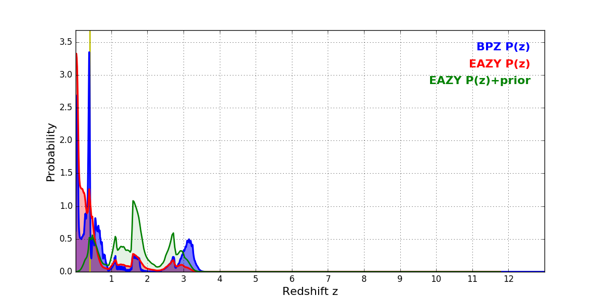 In P(z) plots: Yellow lines mark the cluster redshift z = 0.396,