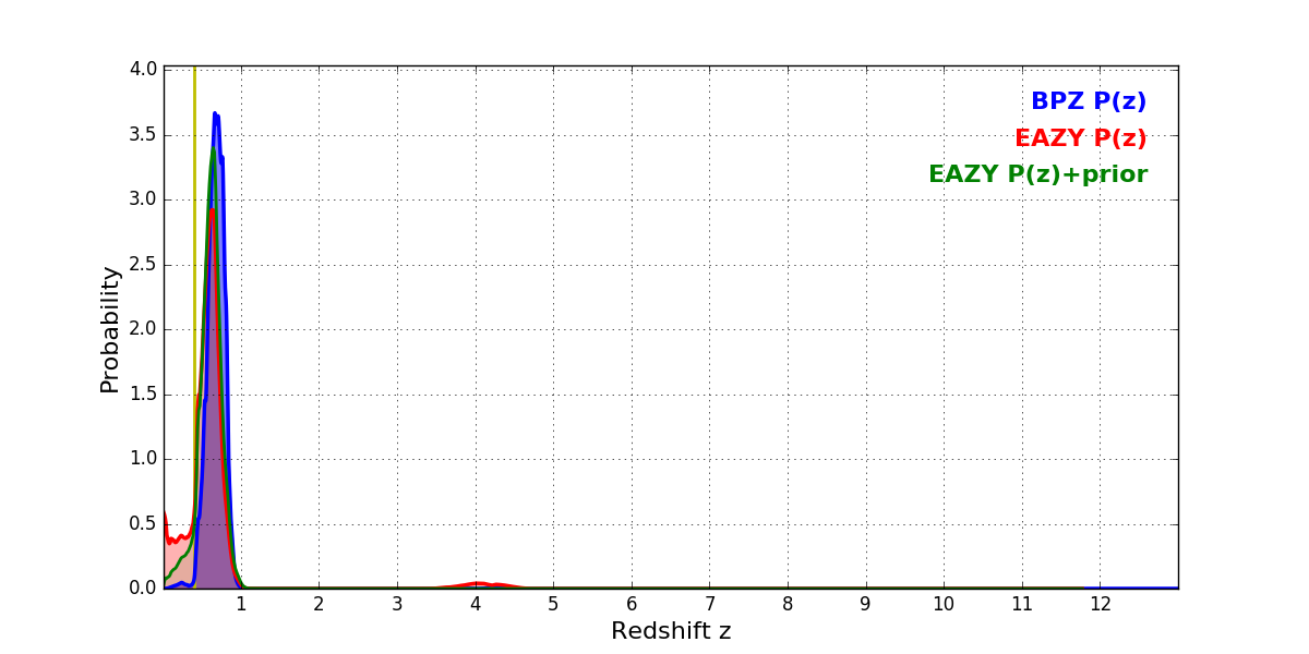 In P(z) plots: Yellow lines mark the cluster redshift z = 0.396,