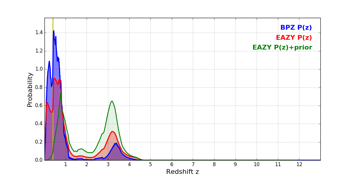 In P(z) plots: Yellow lines mark the cluster redshift z = 0.396,