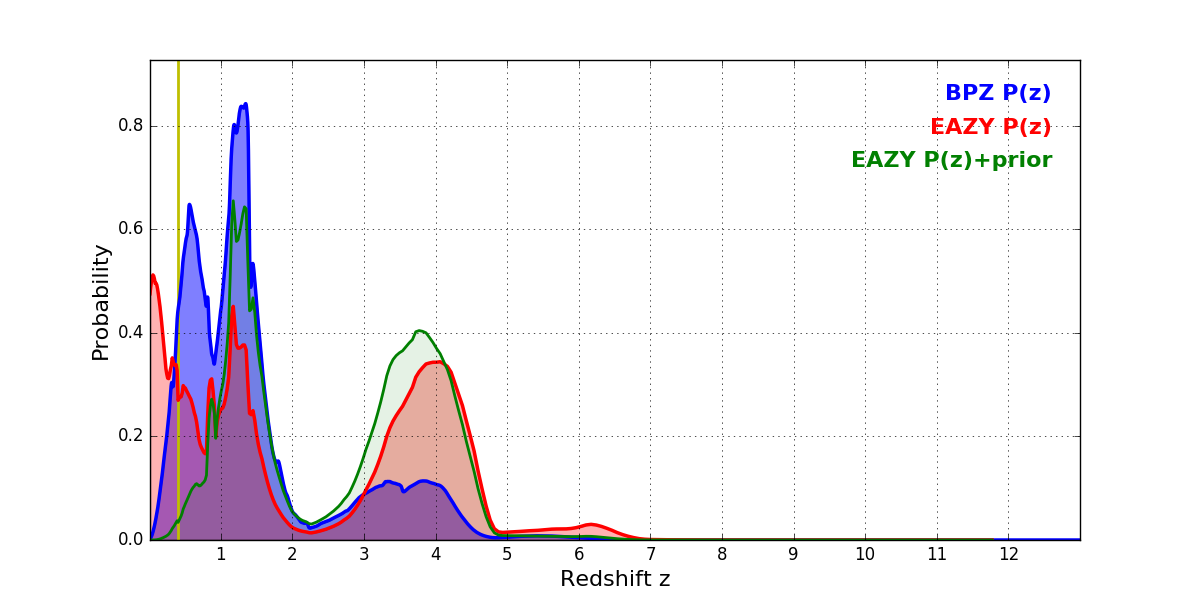 In P(z) plots: Yellow lines mark the cluster redshift z = 0.396,