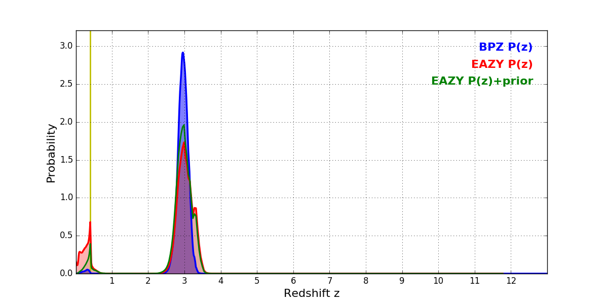 In P(z) plots: Yellow lines mark the cluster redshift z = 0.396,