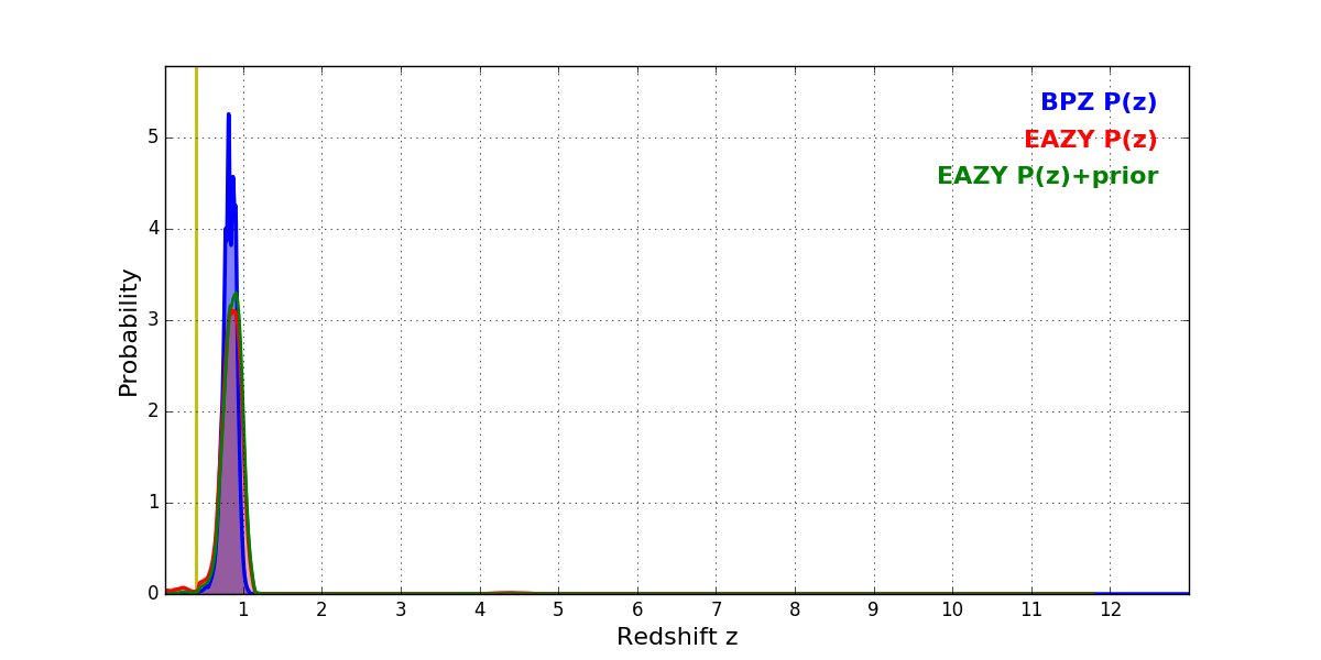 In P(z) plots: Yellow lines mark the cluster redshift z = 0.396,
