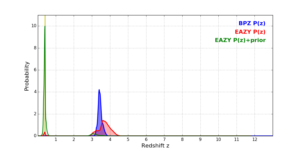 In P(z) plots: Yellow lines mark the cluster redshift z = 0.396,