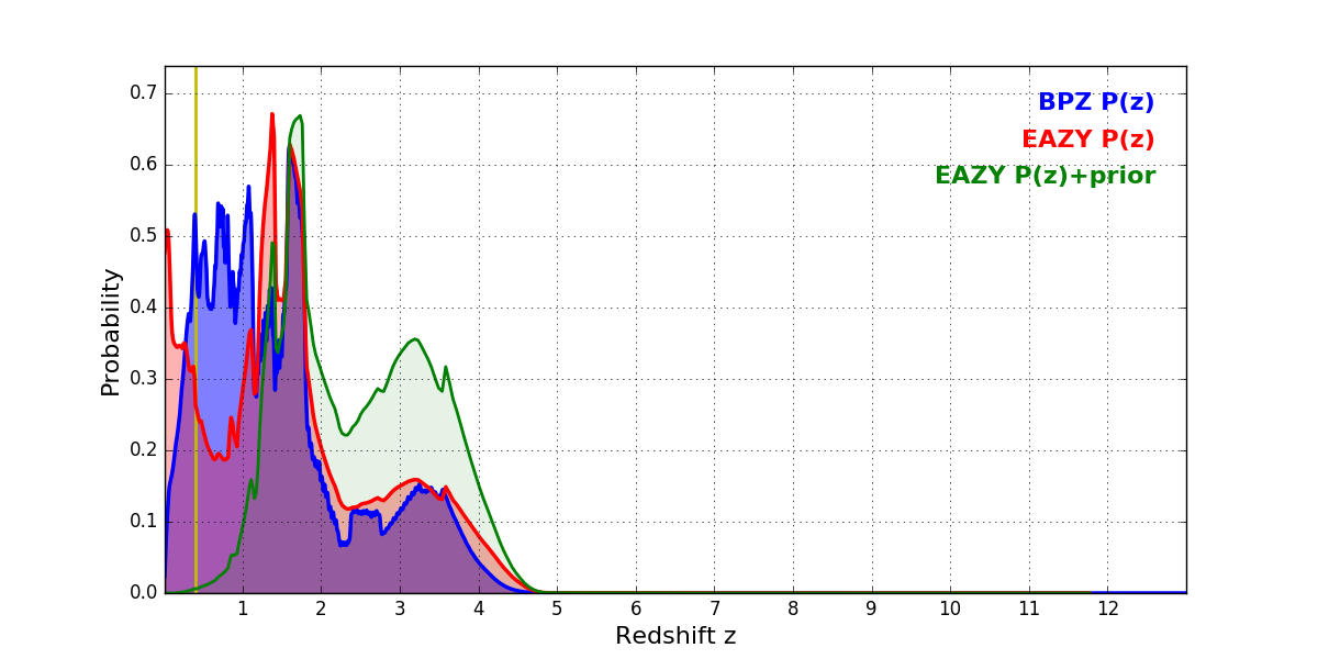 In P(z) plots: Yellow lines mark the cluster redshift z = 0.396,