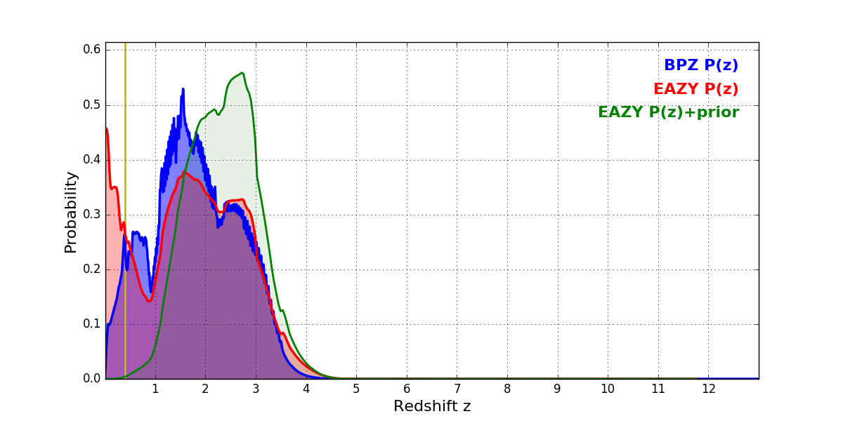 In P(z) plots: Yellow lines mark the cluster redshift z = 0.396,