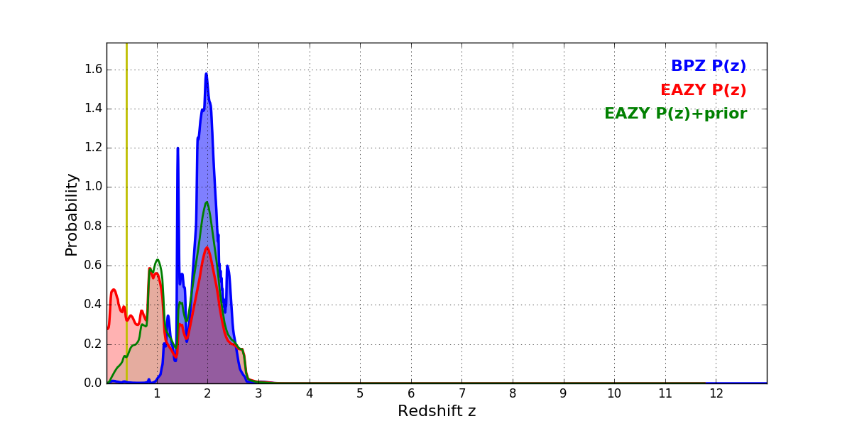 In P(z) plots: Yellow lines mark the cluster redshift z = 0.396,