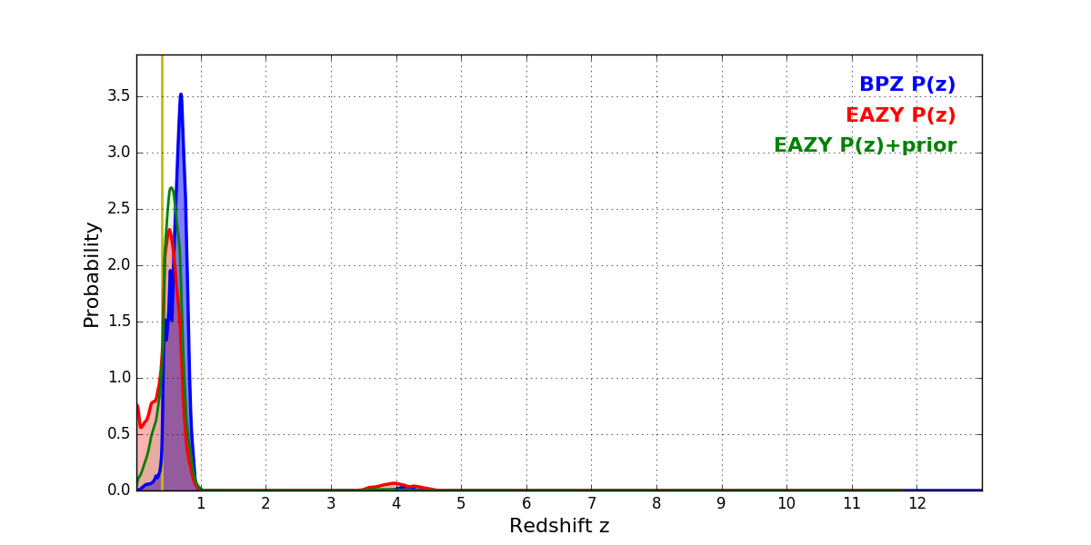 In P(z) plots: Yellow lines mark the cluster redshift z = 0.396,