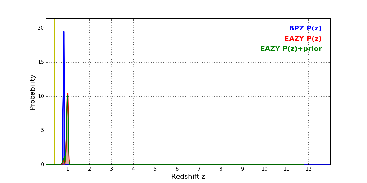 In P(z) plots: Yellow lines mark the cluster redshift z = 0.396,