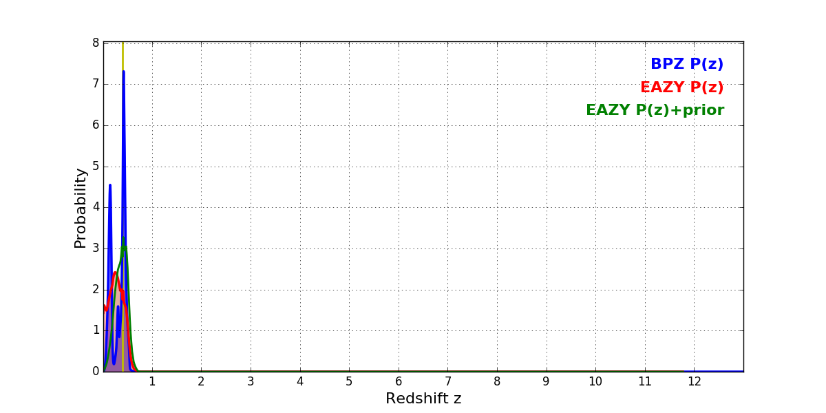 In P(z) plots: Yellow lines mark the cluster redshift z = 0.396,