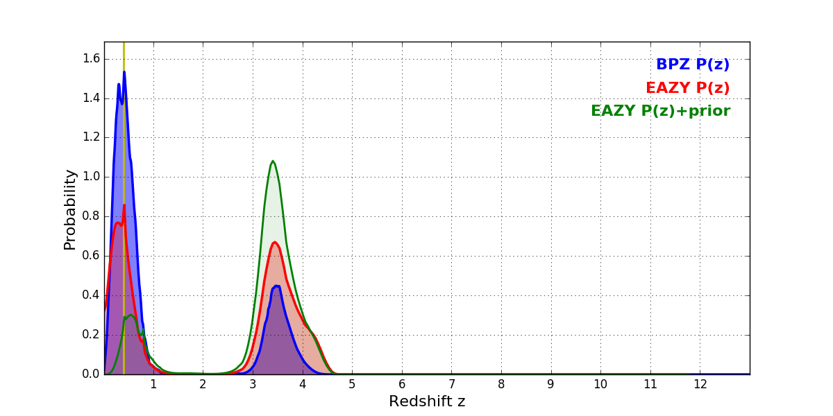 In P(z) plots: Yellow lines mark the cluster redshift z = 0.396,