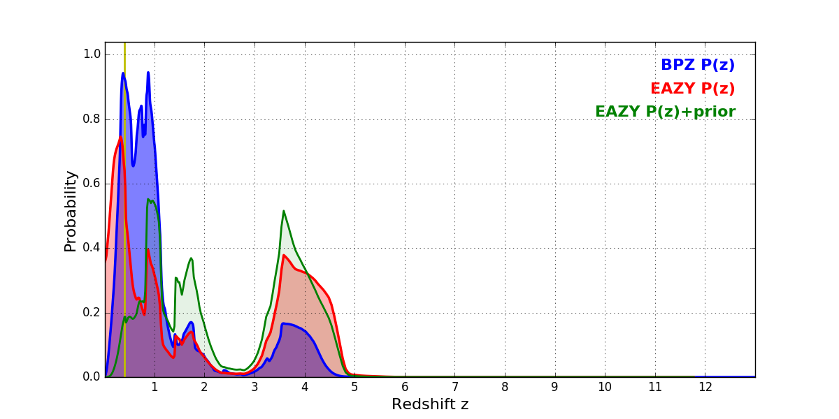 In P(z) plots: Yellow lines mark the cluster redshift z = 0.396,