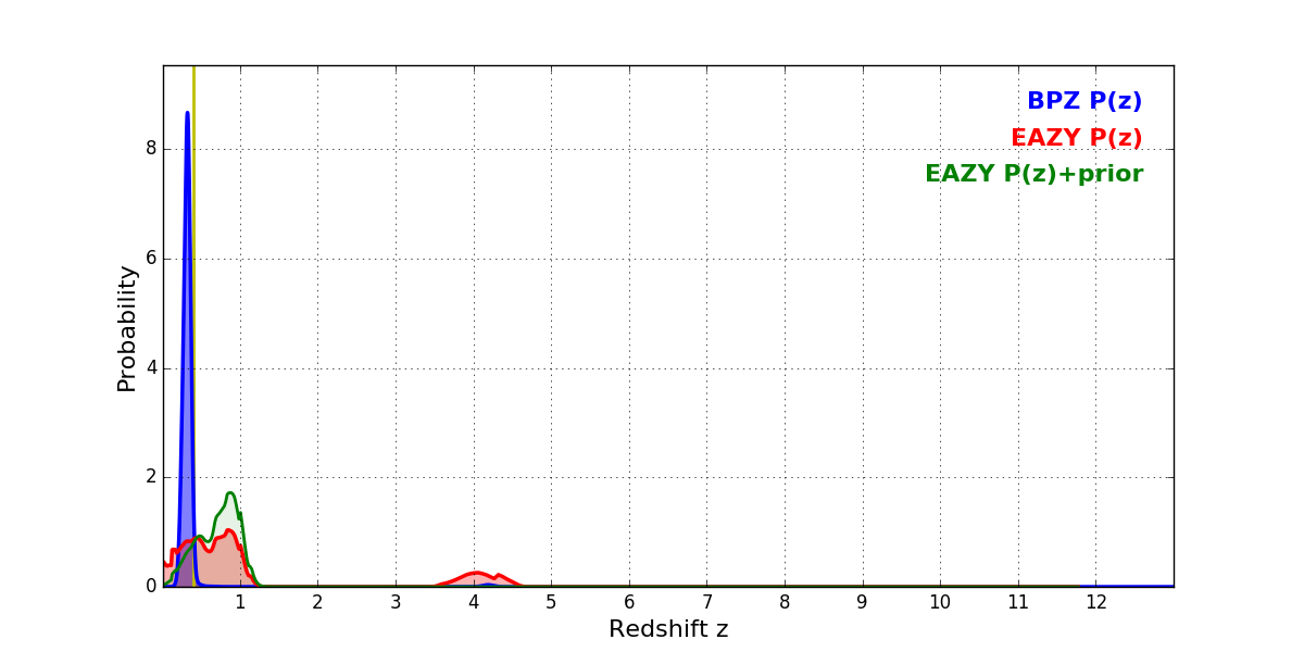 In P(z) plots: Yellow lines mark the cluster redshift z = 0.396,