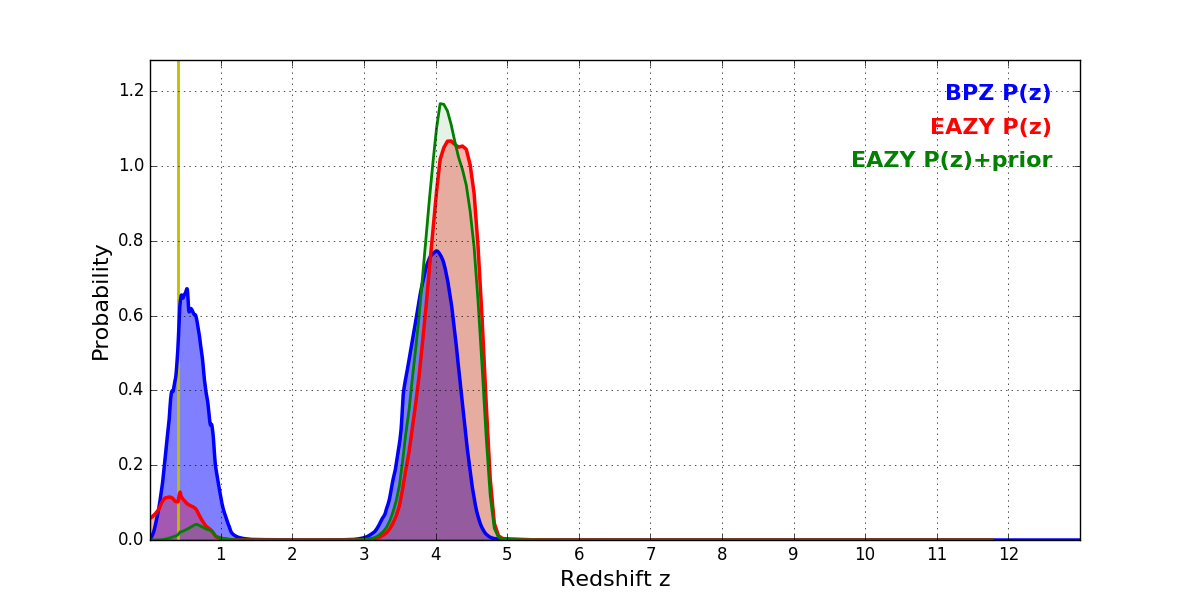 In P(z) plots: Yellow lines mark the cluster redshift z = 0.396,